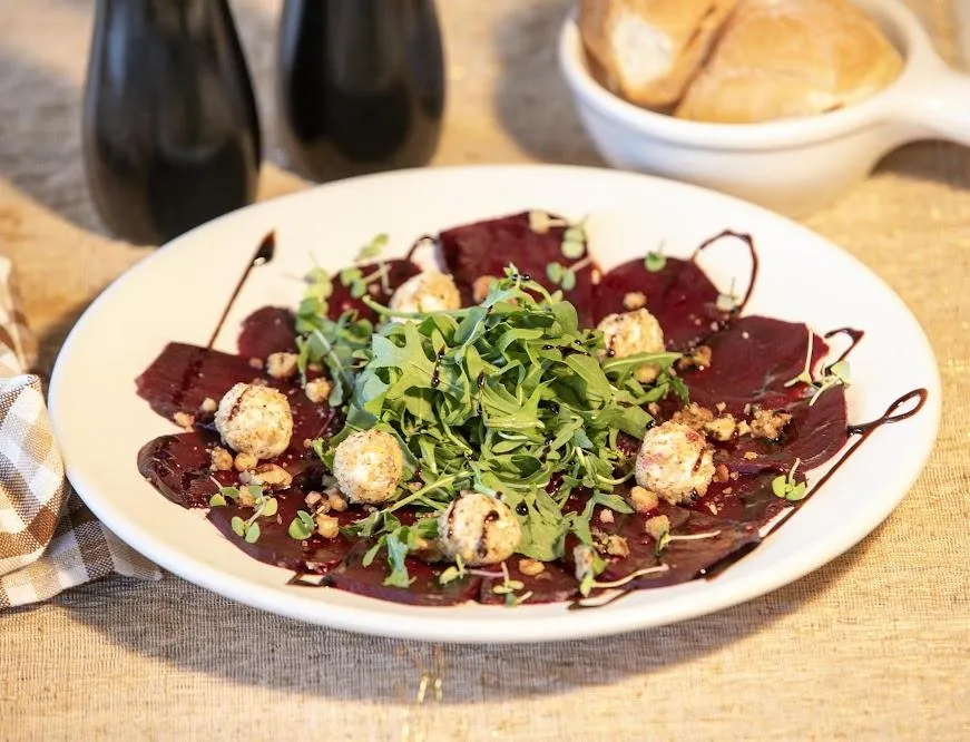 Finas láminas de betabel con nueces garapiñadas, esferas de queso de cabra, miel y arúgula.