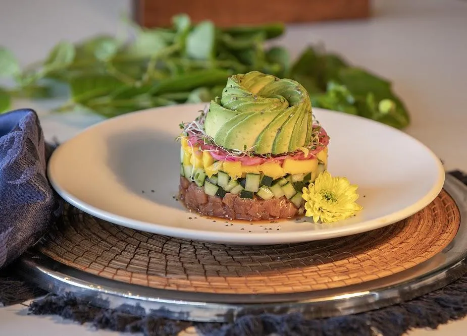 Timbal de atún marinado con mango, aguacate, pepino y cebolla morada, coronado con brotes y salsa ponzu.