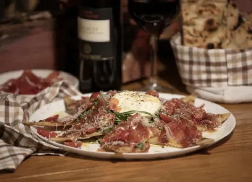 Nuestra masa de la casa, coronada con proscrito, tomates cherry, queso burrata y arúgula, bañado con aceite XV de oliva y lluvia de queso parmigiano.