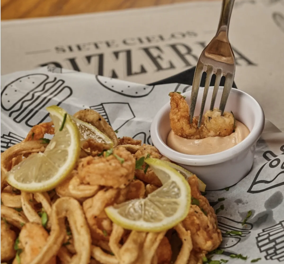 calamares y camarones rebozados con perejil, acompañados con salta tártara