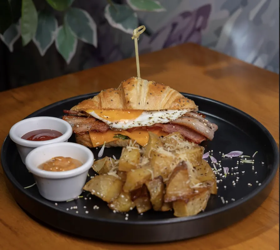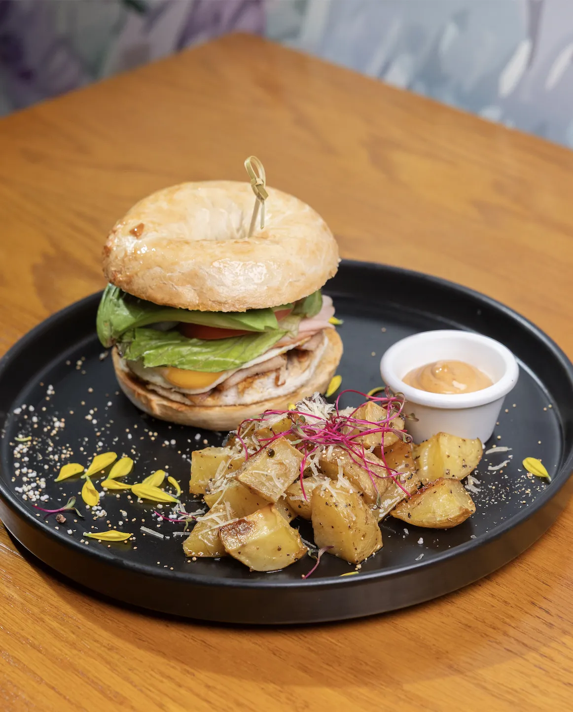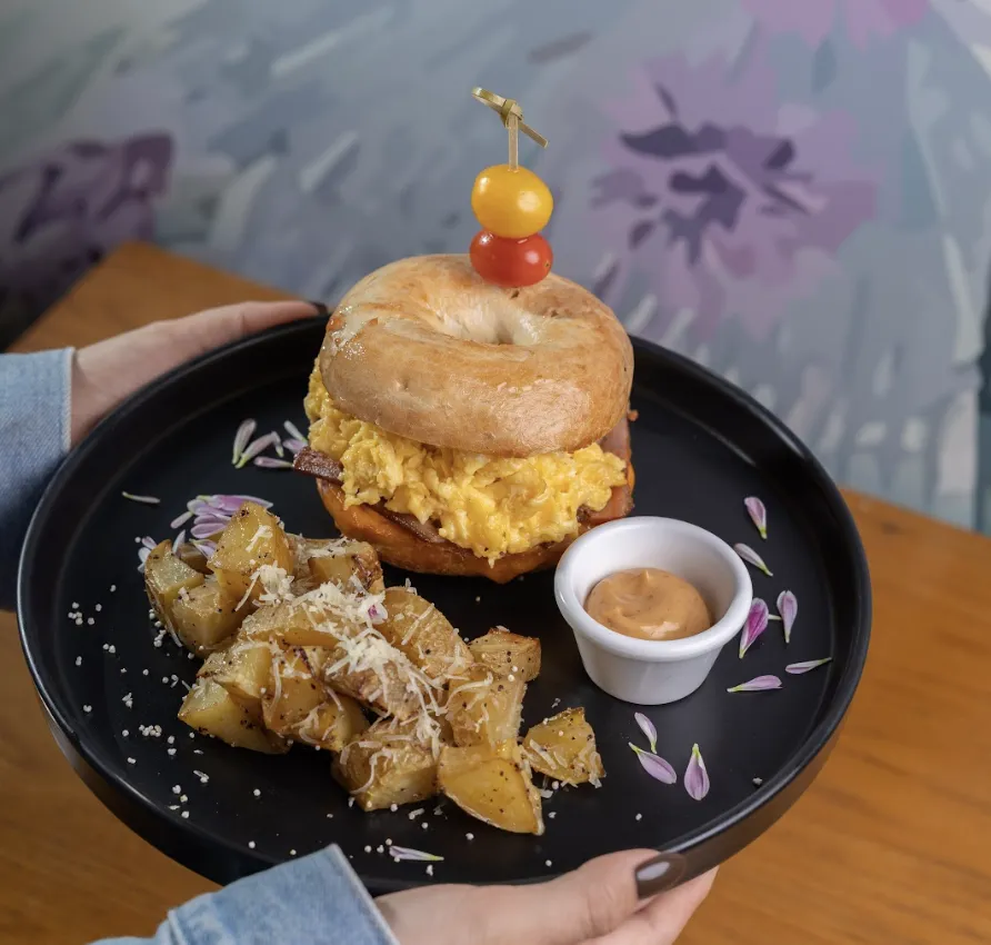 Bagel relleno de huevo revuelto con tocino, queso americano, queso cheddar con aderezo mayochipotle, acompañado de nuestras papas de la casa con parmigianno.