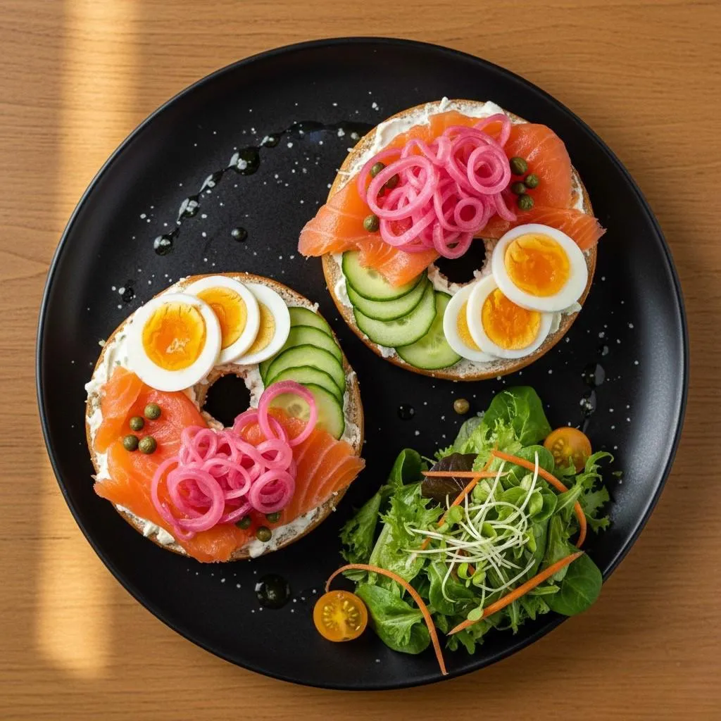 Base queso crema con salmón ahumado, alcaparras, huevo troceado y cebolla morada, acompañado de nuestra ensalada de la casa aderezada con mostaza y miel.