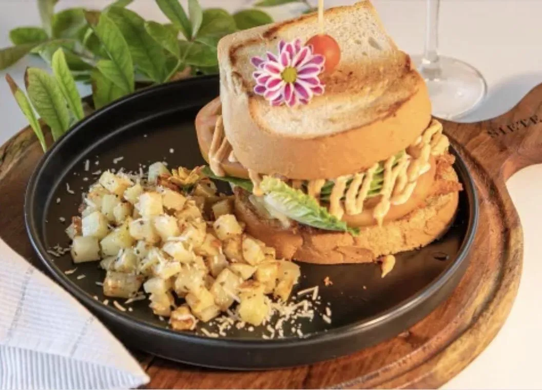 Delicioso sandwich de pan brioche con milanesa de pollo, aguacate y tomate, aderezado con mayonesa chipotle, acompañado con papas de la casa y queso parmigiano.
