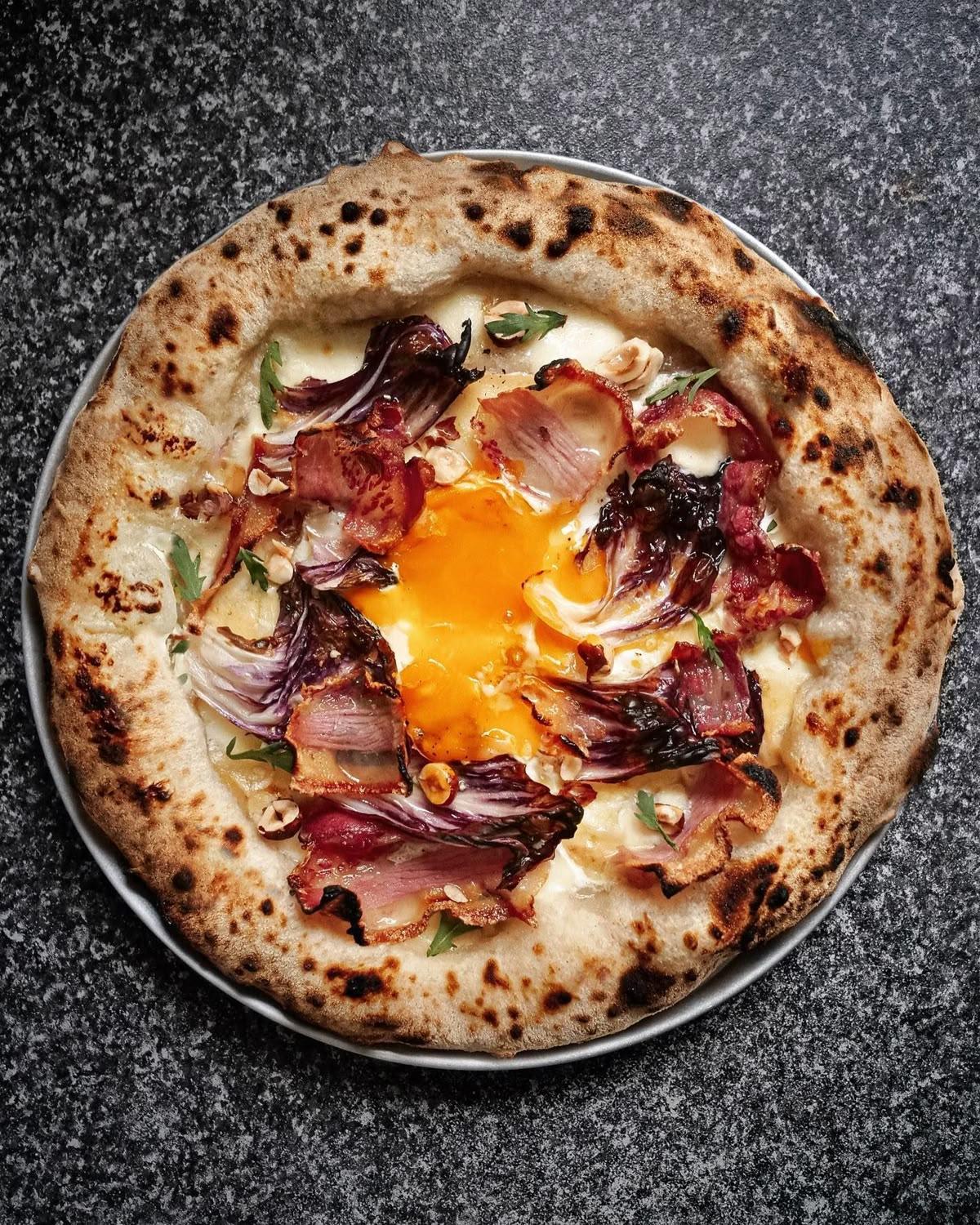 Base blanca con mozzarella fresca, tocino crujiente, cebolla morada rostizada, huevo, parmigiano y un toque de pimienta negra recién molida.