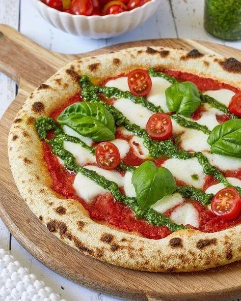 Salsa de tomate, mozzarella fresca, tomates cherry, albahaca y nuestra salsa de pesto hecha en casa.